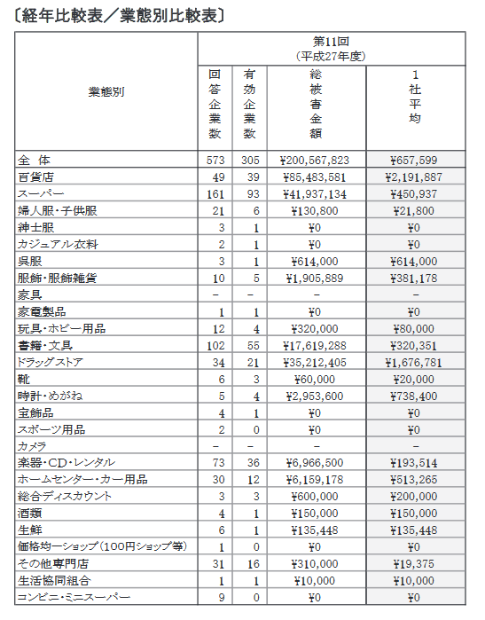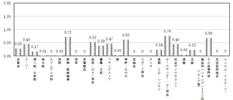 全国万引犯罪防止機構による第11回全国小売業万引被害実態調査分析報告書によれば、ドラッグストアの年間総売上に対する不明ロス金額の構成比は0.47%で、ホームセンター・カー用品(0.76%)、服飾・服飾雑貨(0.72%)、その他専門店(0.68%)、時計・めがね(0.62%)、玩具・ホビー用品(0.53%)に次ぐ第6位となっている。有効回答220社の平均は0.41%である。
