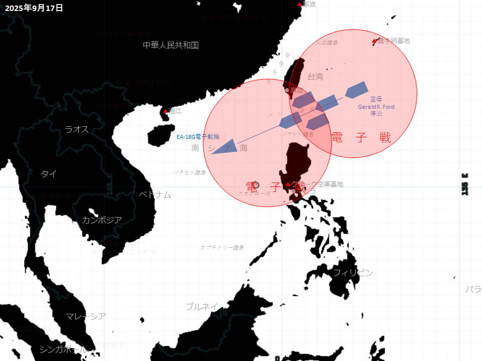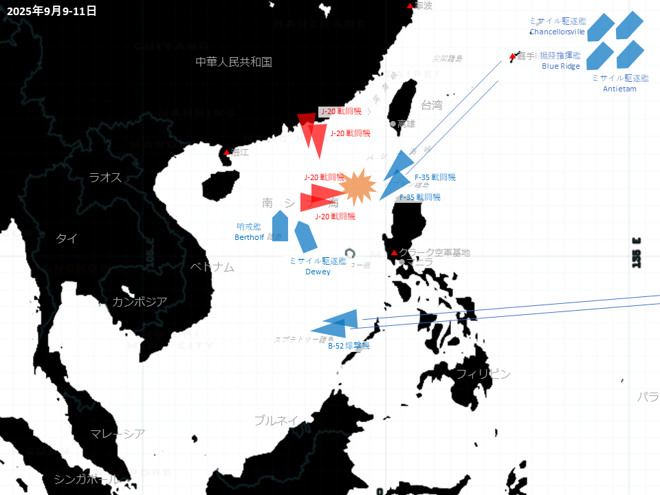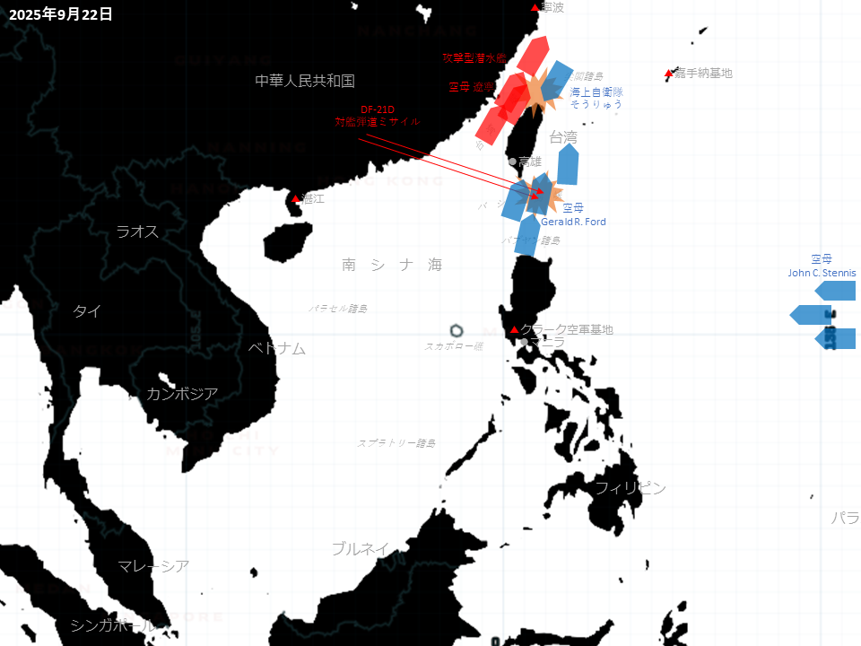 9月16日フィリピン・ルソン島の北西175海里にいた中国の空母遼寧は、沖縄の南東にいるGerald R. Fordを威嚇しようとジェット機を発進させた。これらの中国機はGerald R. FordのF-35と沖縄から発進したF-22によって撃破された。これにより、遼寧とその船団は事実上、前進することができなくなった。