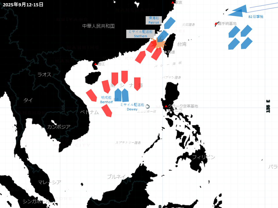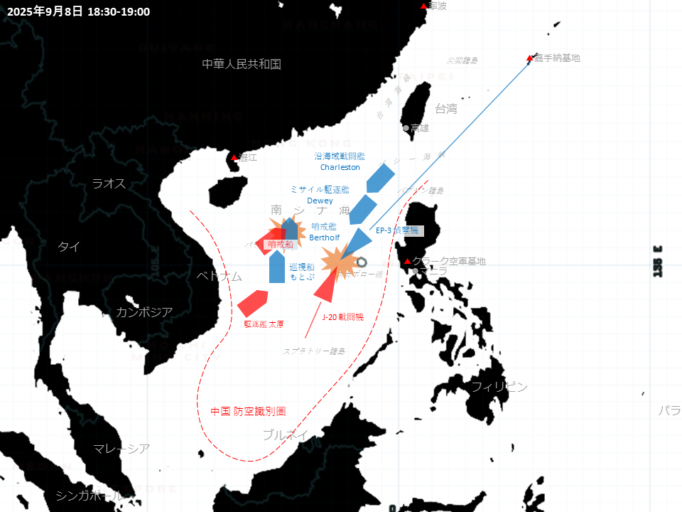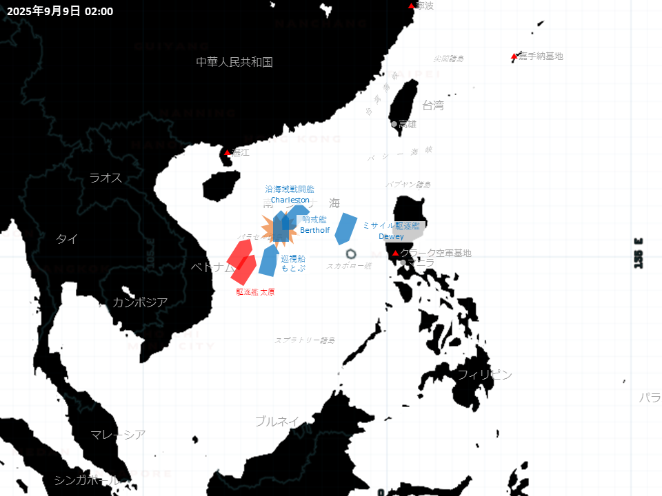 9月15日、中国人民解放軍海軍南海艦隊の機動部隊が、スプラトリー諸島沖で傷ついたBertholfを守っていたDeweyに到達した。中国軍はDeweyの周囲を取り囲み、この2隻を孤立させた。一方、フィリピンでは中国の諜報機関に誘導された反米運動が高まり、ドゥテルテ元大統領がデモ隊の先頭に立って中国との関係回復を要求した。結果的にフィリピンの現大統領がクラーク空軍基地の米軍機利用を拒否したため、米軍の南シナ海での航空支援は事実上中断することとなった。