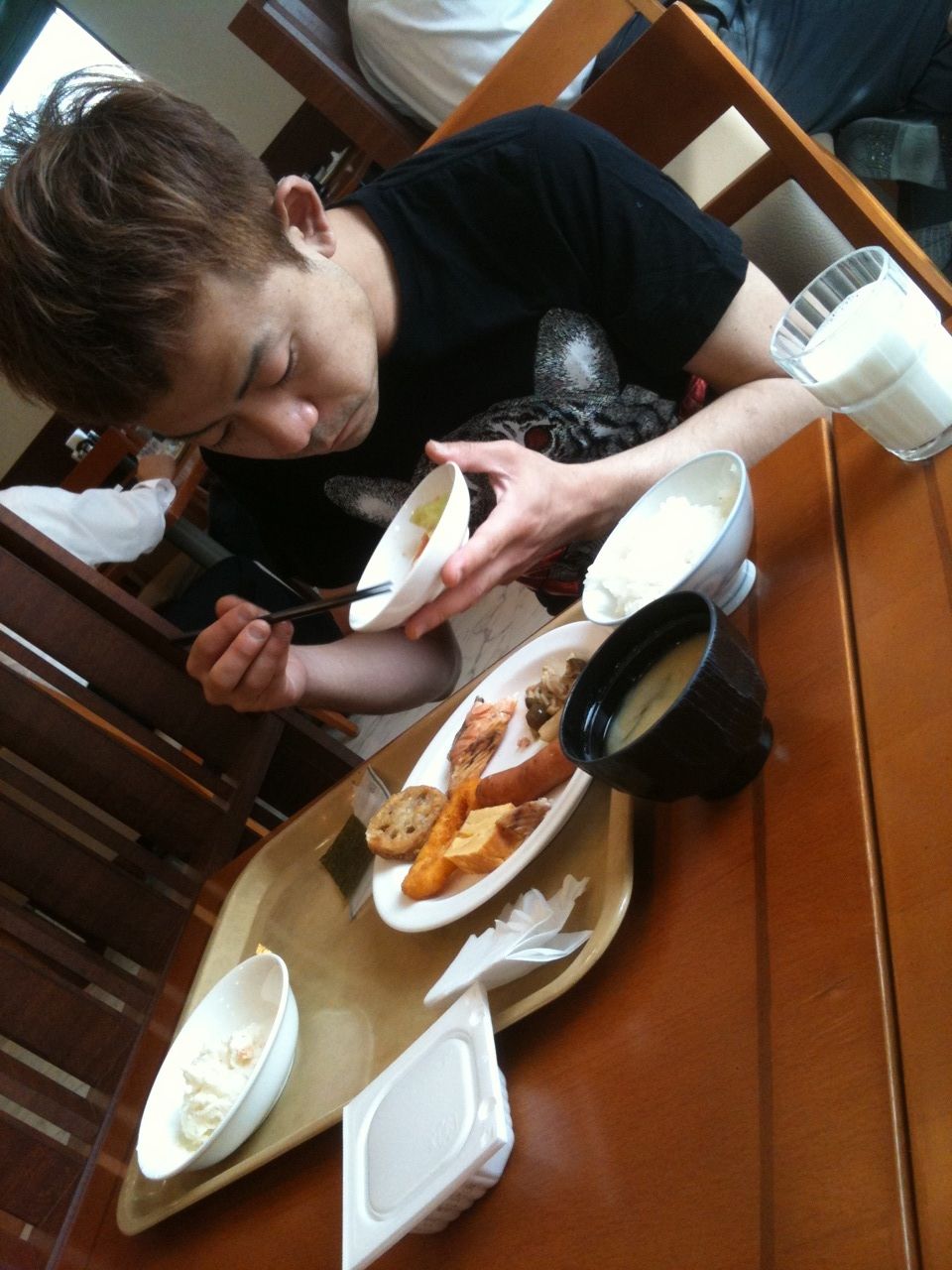 卵焼き、鮭の塩焼き、ソーセージ、イカリング、レンコン挟み揚げ、というタンパク質料理を全品チョイスしていて、やるなと思いきや、なんとよく見ると納豆と牛乳まで。