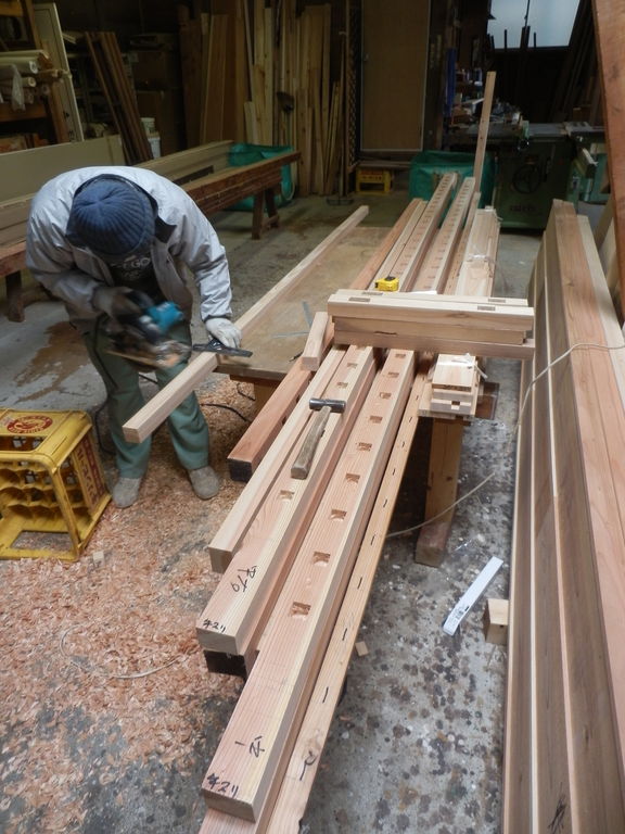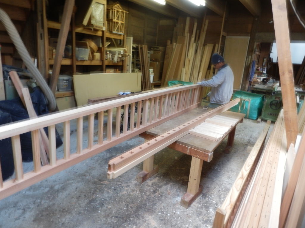次は窓の手摺の加工です、ごく単純な縦格子手摺ですが釘を使わず組み立てていきます。