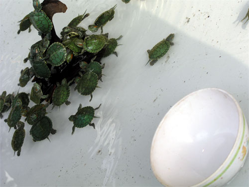 きゅうり浅漬け屋台や、ポニョグッズ専門くじびき、「コードギアス」や「リボーン」グッズを取り揃えたジャンプ系腐女子専門屋台など、今年もいろもの屋台を多数発見したのだが、金魚ならぬミドリガメすくいの屋台のおっさんが「大きくならないよー、プラケースで飼えるよー」と言ってたのが一番のヒットだった。勿論、ミドリガメは体調が最大で30 cm以上に達するミシシッピアカミミガメだ。