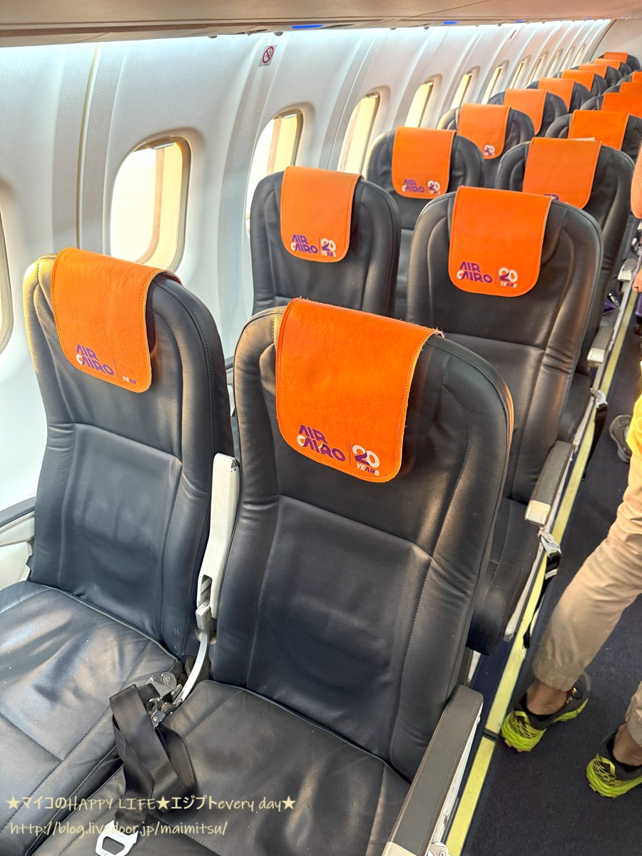 写真がちょっと前後してしまうのですが、Air Cairoのシートはこんな感じでした。撮影したのは降りる時