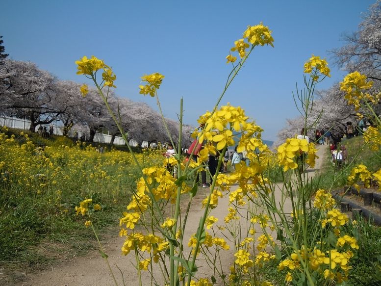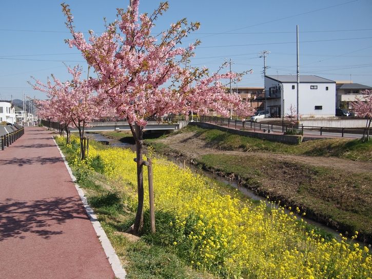 さらに道沿いにある菜の花を愛でて、田原市福江は免々田川の河津桜と菜の花を見て