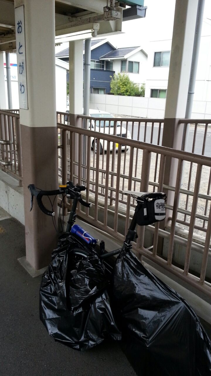 あちこちお店を回ってポリ袋を手に入れて、男川駅から電車の人へとなりました ホームに着いたら土砂降り一歩手前の降りかたにホッと一息です