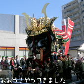 ここは、曳山もよく見えるから迫力満点。太鼓やかけ声や笛の音もよく聞こえる。あんなに長〜〜い綱をたくさんの人達が曳いてるんだなぁ。山に乗った人が塩をまくので、すぐ下の人は塩まみれ。コドモは「砂まきよるね」って言ってたんで、「あれは塩だよ」「い〜や、あれは砂!」「塩って!」「砂だって!」・・・。