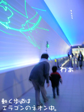 動く歩道の途中にレーザーのネオンみたいのが光ってるので、しばし見学。映画「エラゴン」のプロモーションでした。動く歩道は5才児的に走らずにいられないようで、あっという間に終わり。