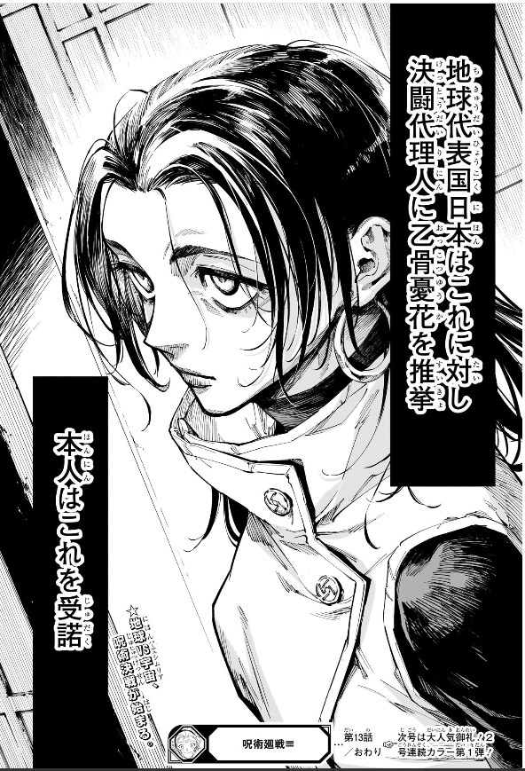 かくして、年が明けて2087年1月、シムリア代表のダブラ・カラバより、呪霊保護と東京割譲を目的とした決闘が申し込まれ、地球代表国日本は、これに対し、決闘代理人に乙骨憂花を推挙。本人もこれを受諾する・・・・というところで、以下次回。