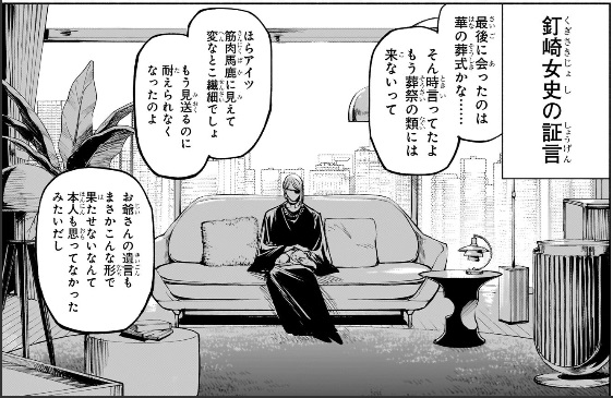 また、釘崎の言う、「お爺さんの遺言も、こんな形で果たせないなんて・・・・」の遺言とは、祖父の倭助が遺した、「オマエは大勢に囲まれて死ね」という遺言のことですが、これが果たせないということは、不老に加えて、不死でもある、と。