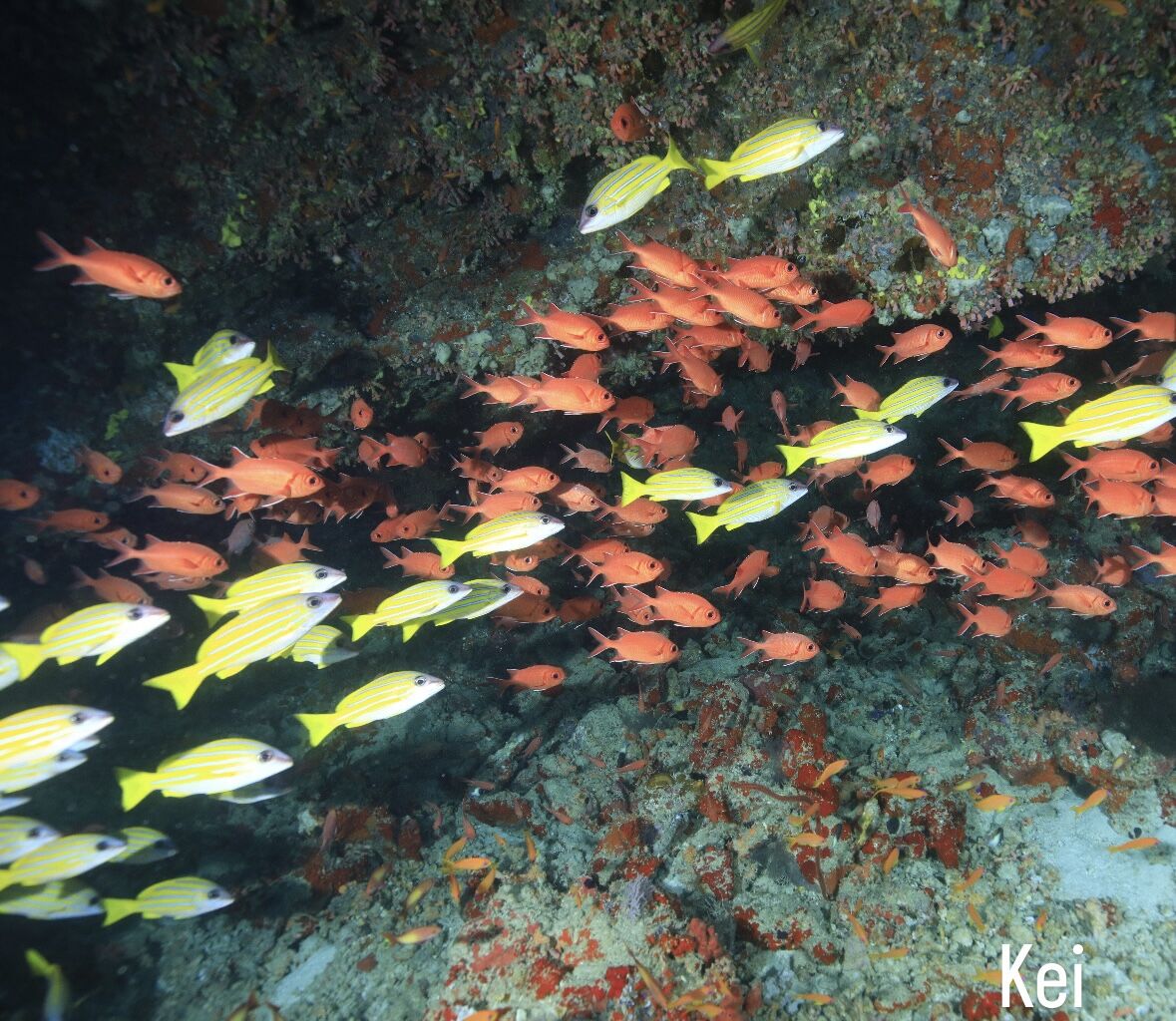 オーバーハングの中でアカマツカサとヨスジフエダイがコラボしており赤と黄色の色合いが非常にキレイです!