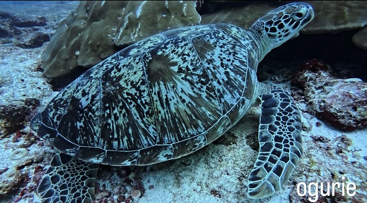 大きなアオウミガメがスヤスヤおやすみ中で
