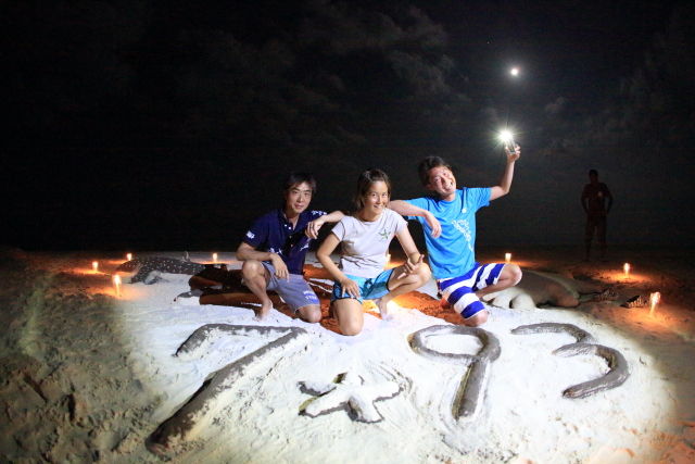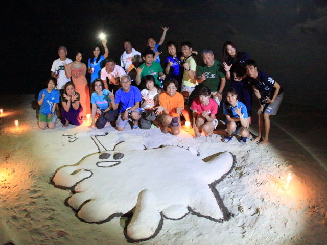 夜はビーチディナーでした。 暗くなる前にクルーが砂のジンベエやマンタを作ってくれるのですが、 今回は輝さん作のキャラクター『ペリセンくん』もみんなで作りました。