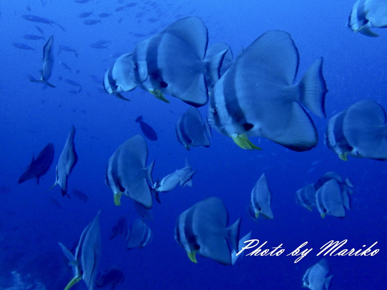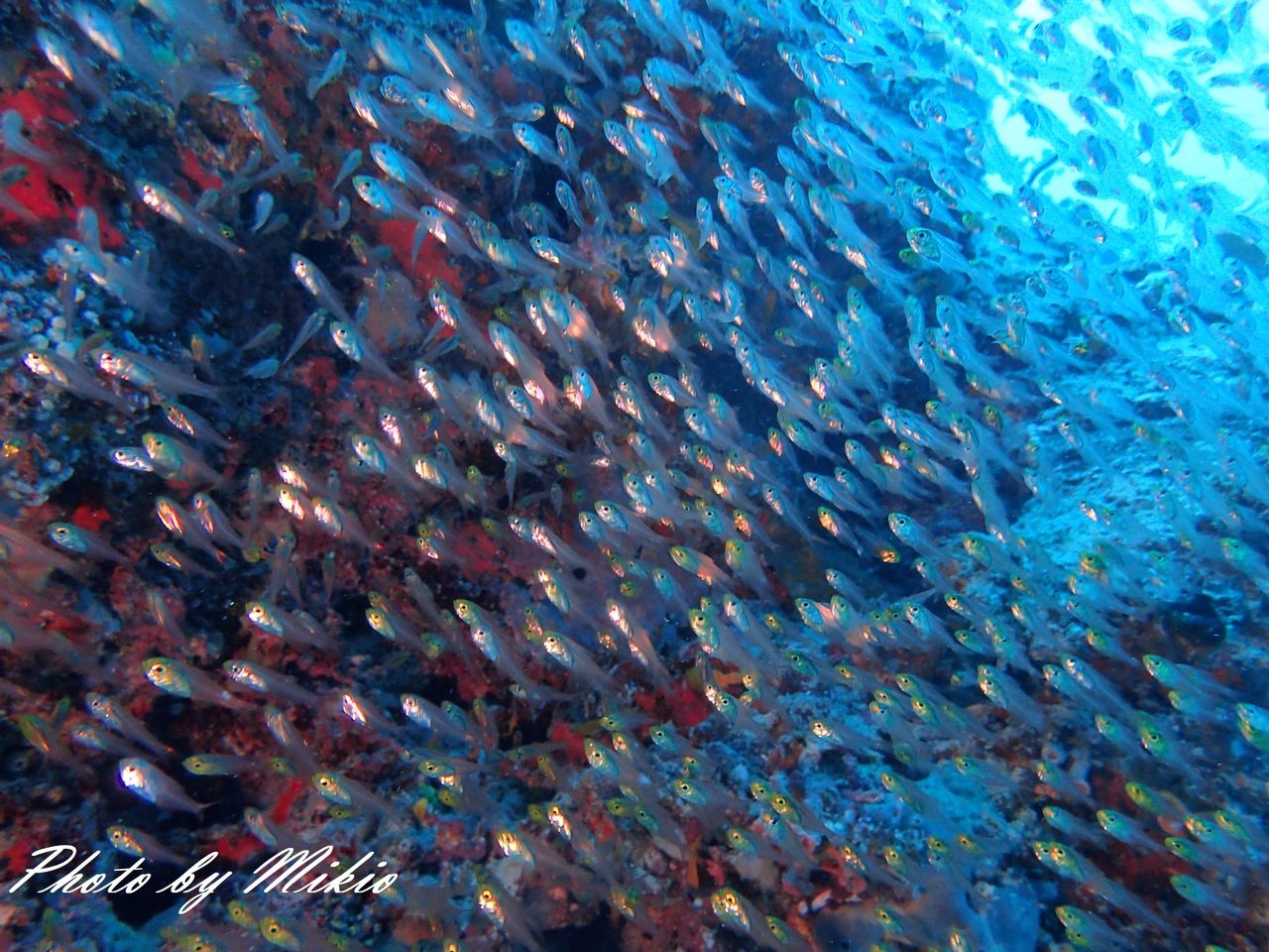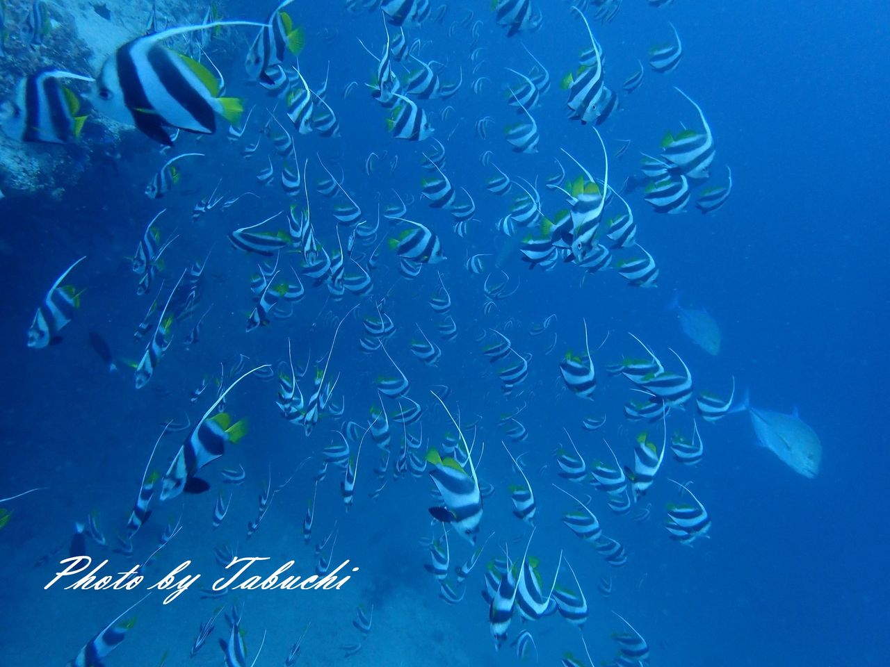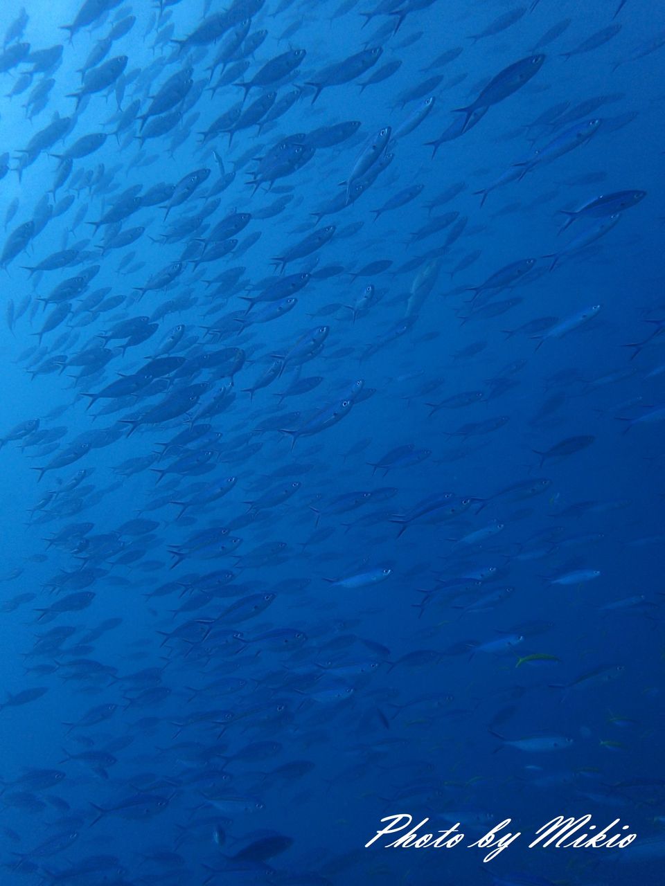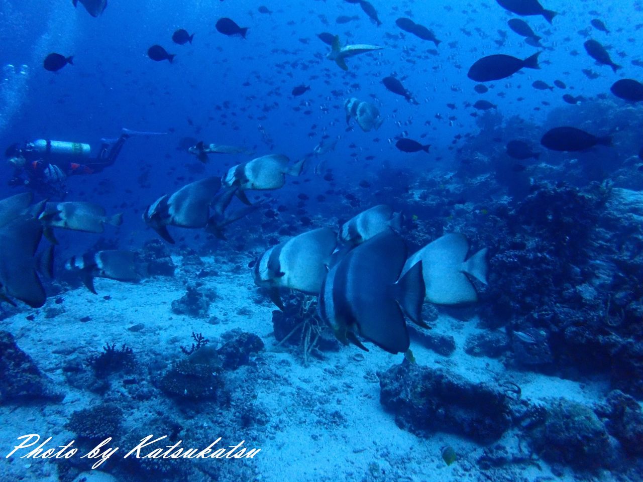 早朝なのでクマザサハナムロの大群を捕食するカスミアジ、マダラトビエイも観れました。