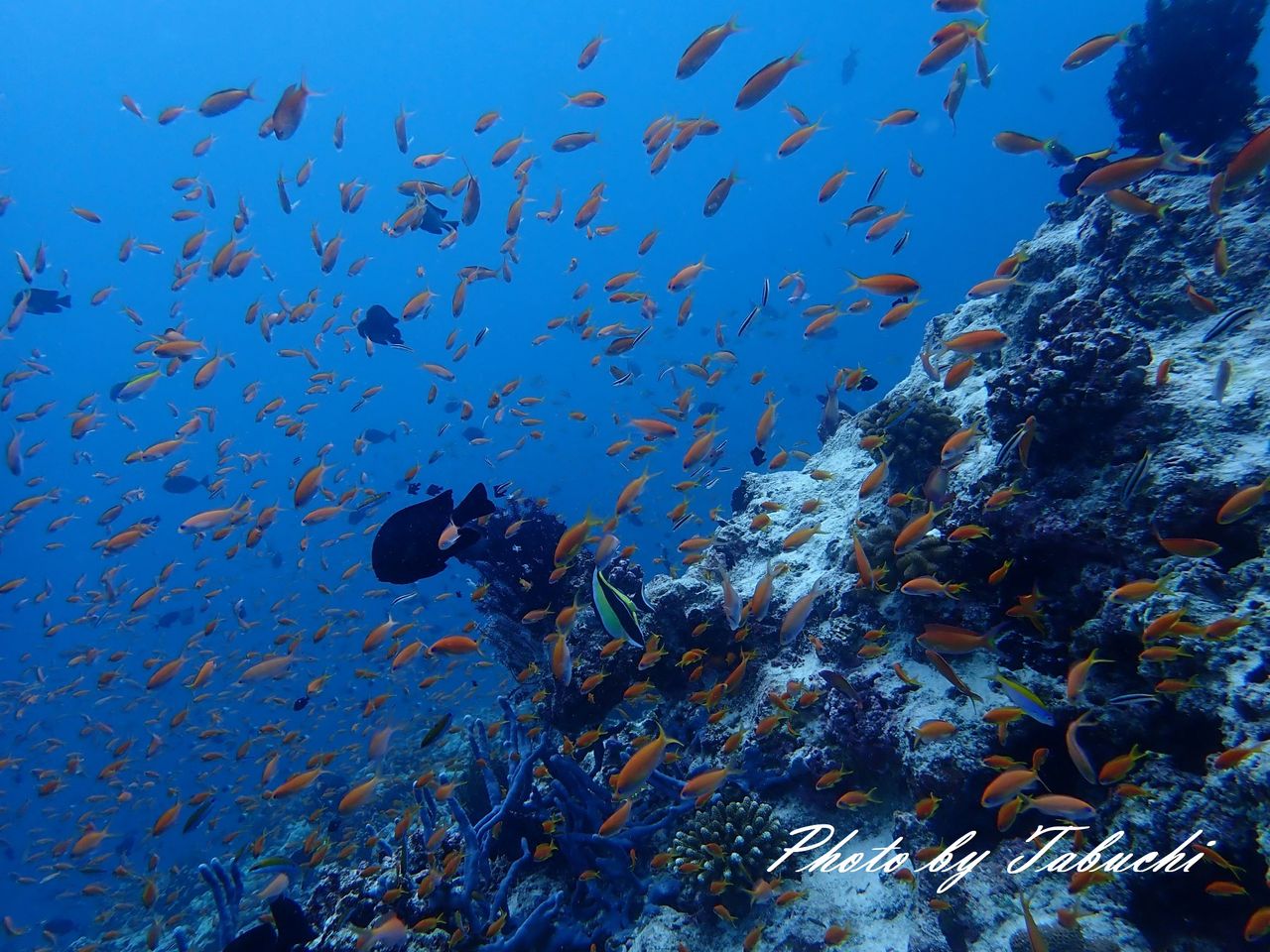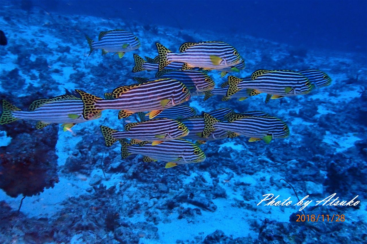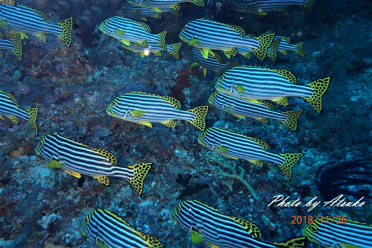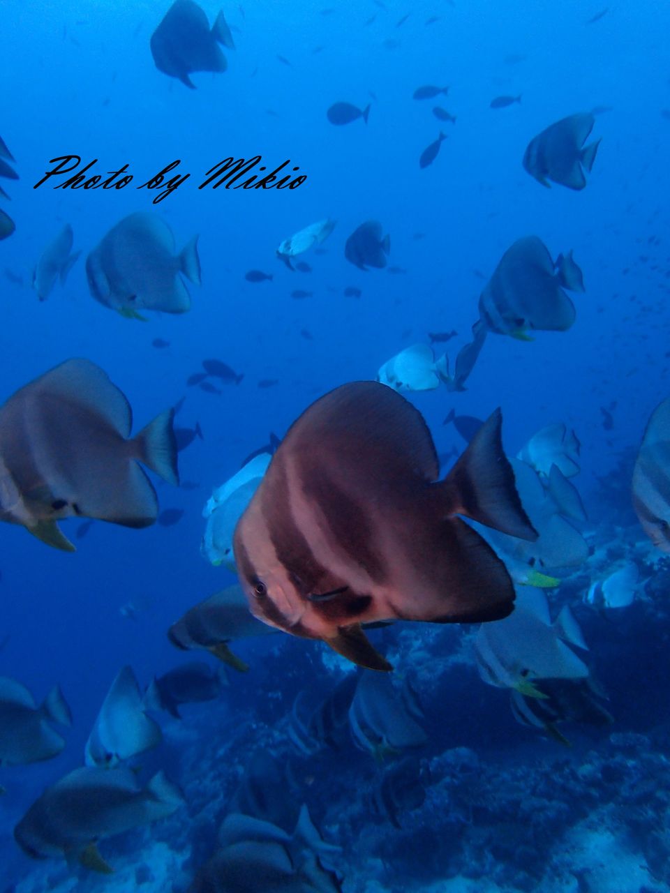 早朝なのでクマザサハナムロの大群を捕食するカスミアジ、マダラトビエイも観れました。