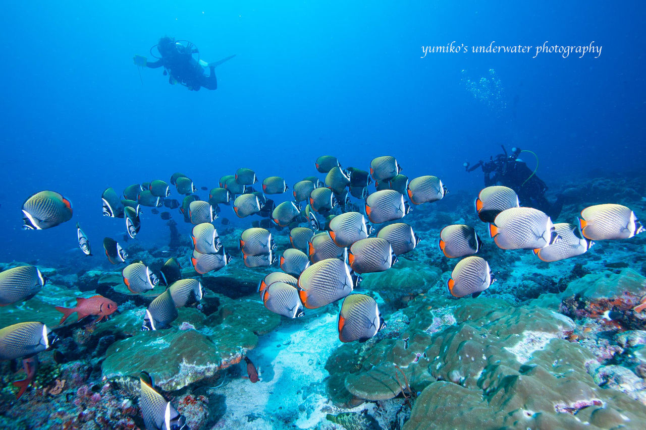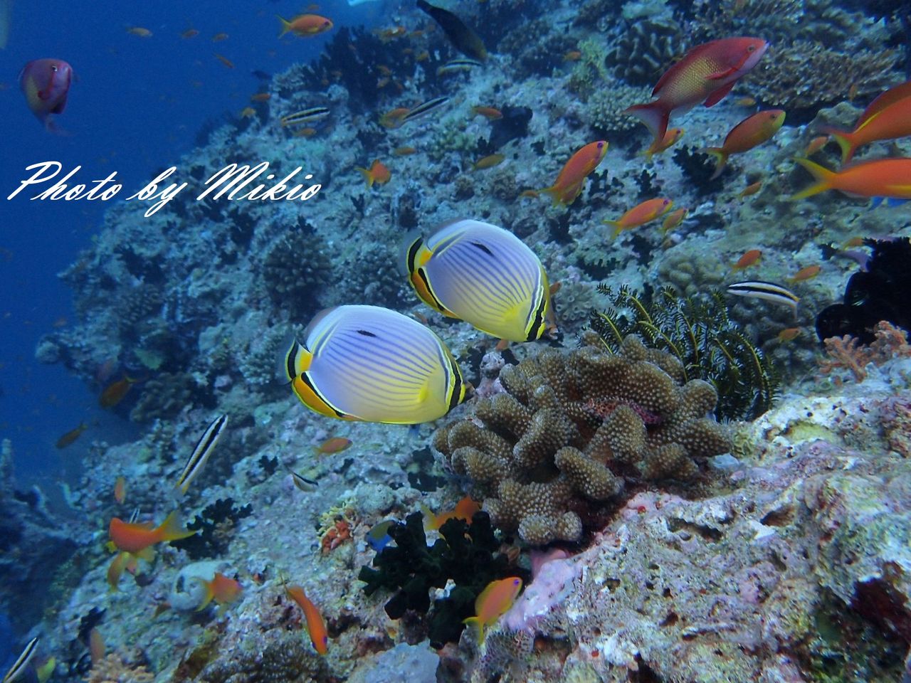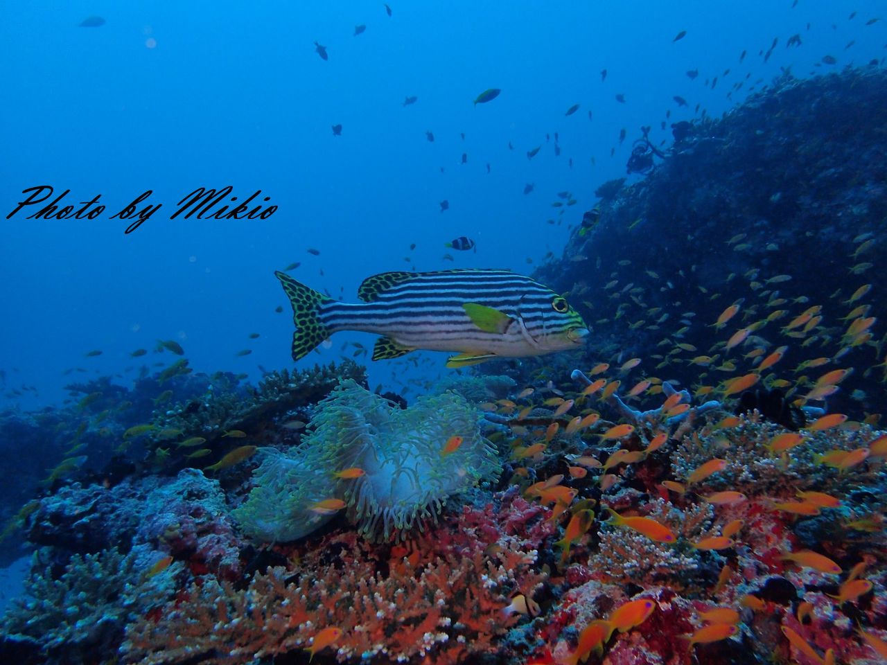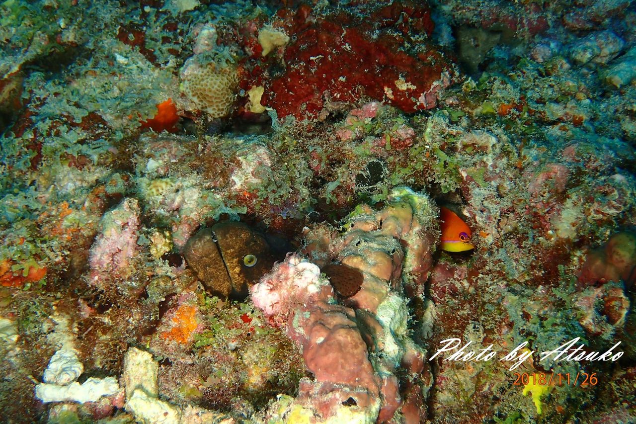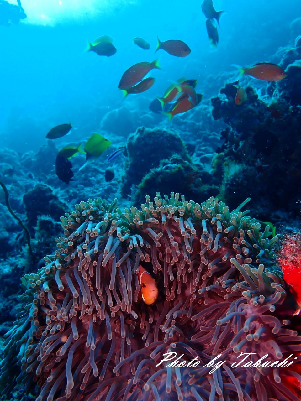 早朝なのでクマザサハナムロの大群を捕食するカスミアジ、マダラトビエイも観れました。