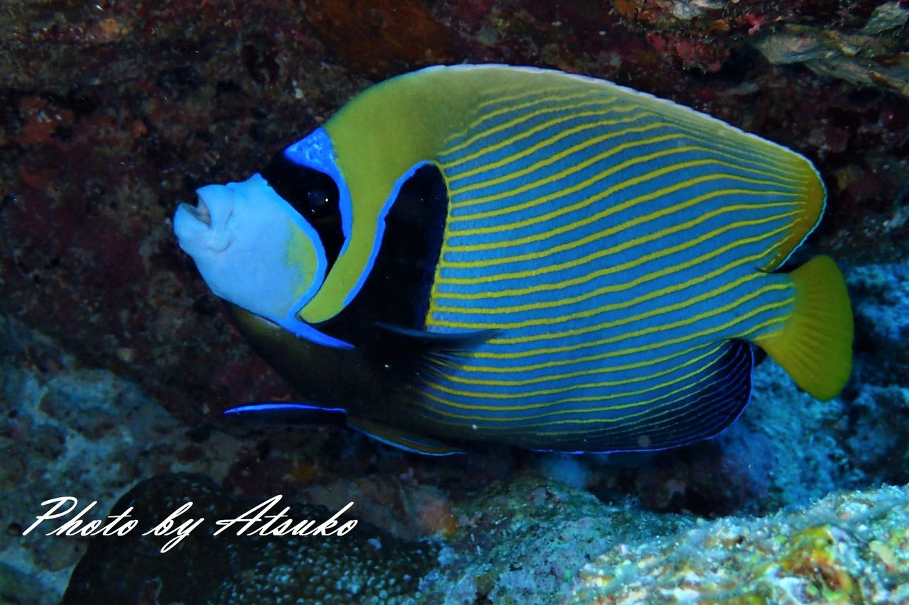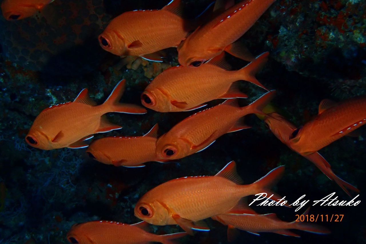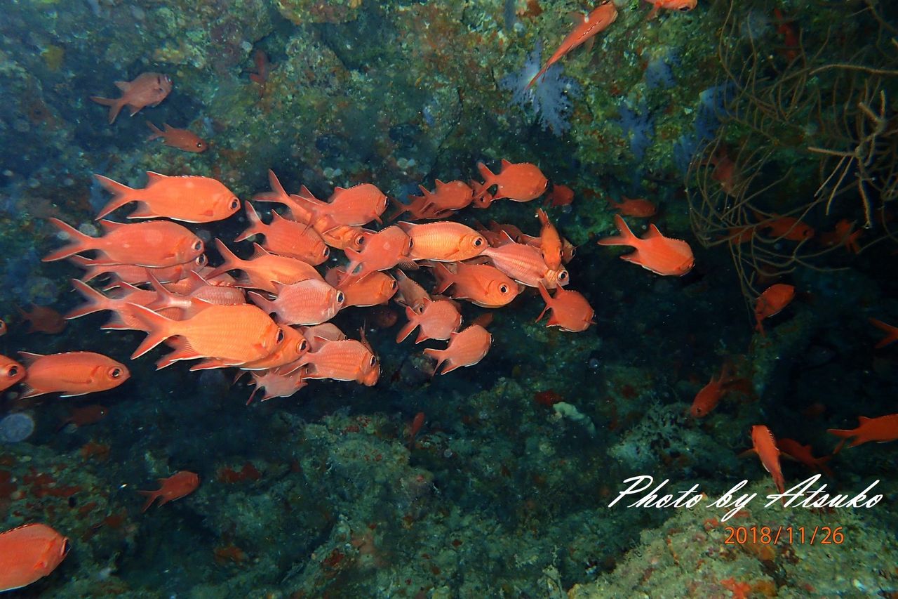 オーバーハングが所々にあり、中にはテンジクダイやアカマツカサが群れています。