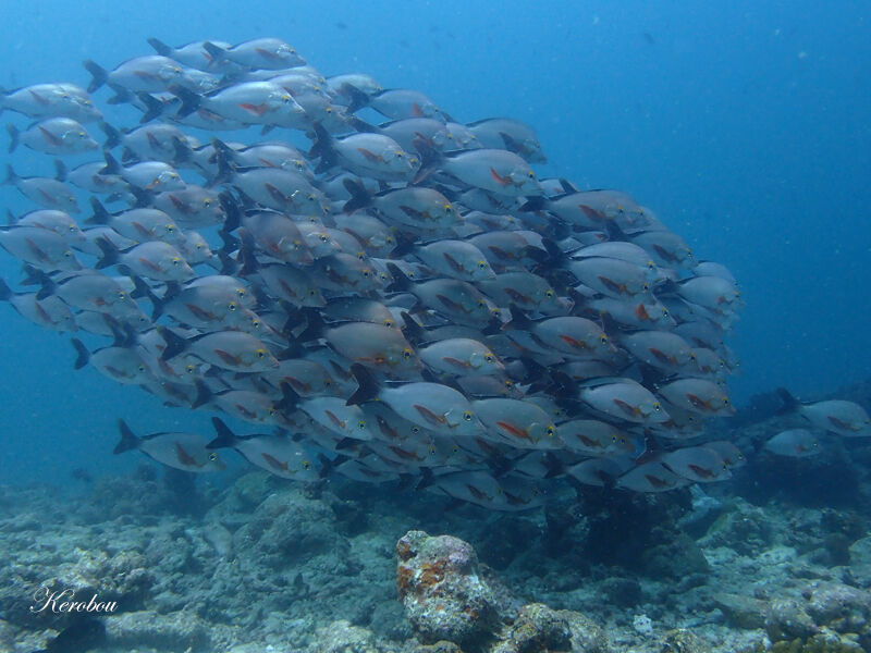 根をヨスジフエダイが覆いつくし、カスミアジの群れやロウニンアジがクマザサハナムロを追いかけまわす!