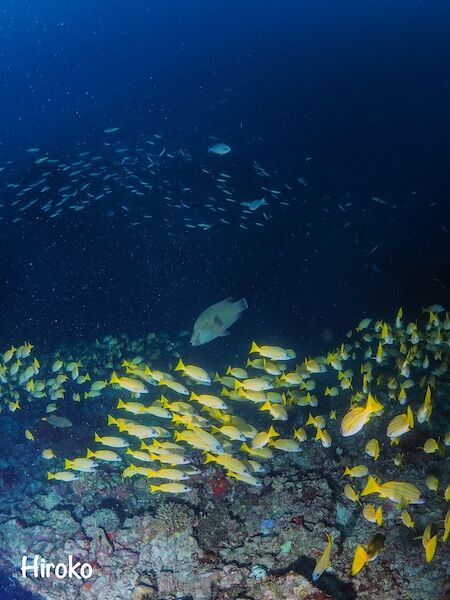 それを狙うホワイトチップシャークとロウニンアジの群れが昼間と違い活発に〜!!