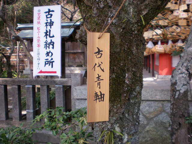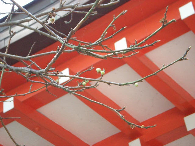 本殿左手、古代青軸(ウメ)は、花の中心が青みがかった白梅。もう終わって、小さな青い実が成っていました