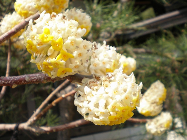 ▼石段脇のミツマタ。初めて花が咲いているのを見ました。下を向いて咲くのですね〜。