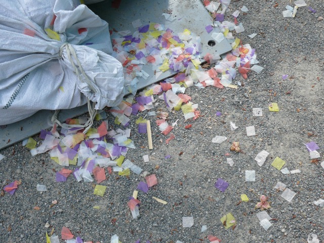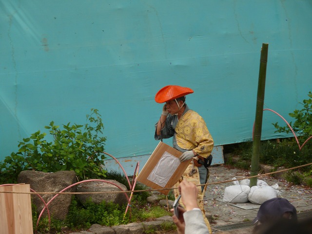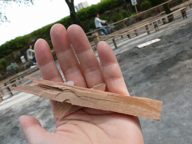 いただきました。的中して割れた的のカケラ。(写真右)は飛び散った切麻(きりぬさ)です。