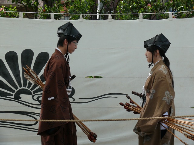 ▼右の射手から順にひとりずつ的に向かって矢を放っていきます。