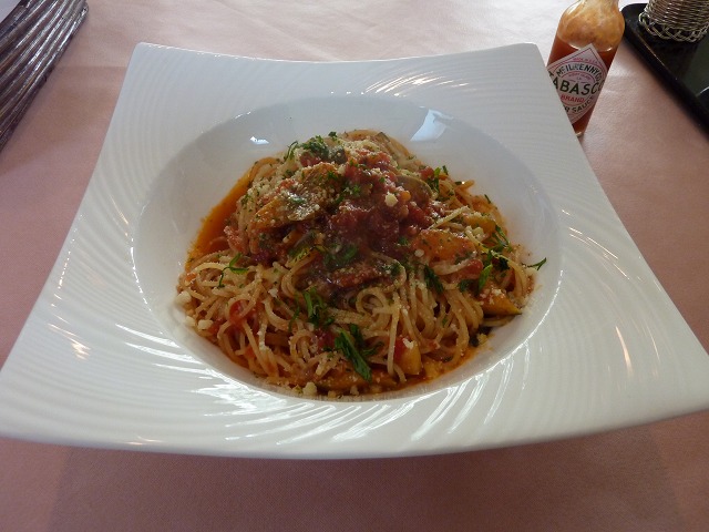 ▼もらったビラとオーダーした「茹で上げスパゲティー:茄子とズッキーニのトマト添え」です。美味。