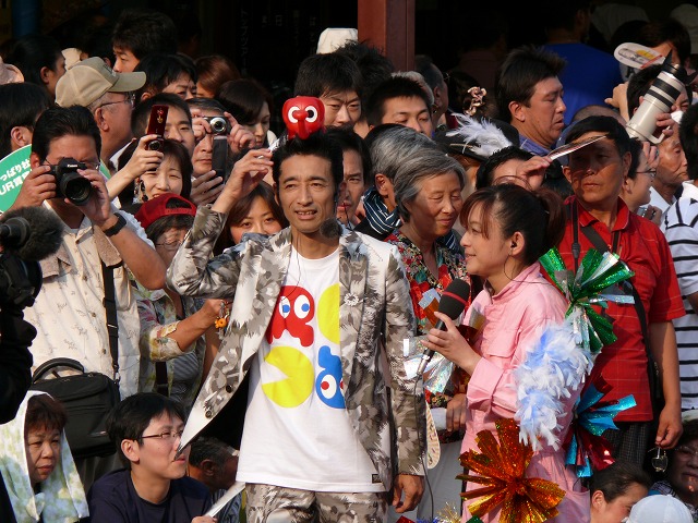 浅草の〜り〔海苔〕、のり、雷門ヘソ隠せ…。とかいう自作の曲に合わせてダンス踊ってました。健在ですな