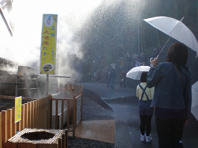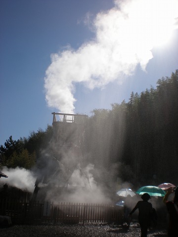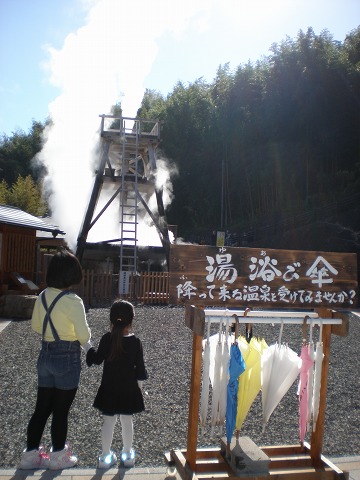 ▼11:30からの「大噴湯」見学します。傘を差して浴びることもできます。