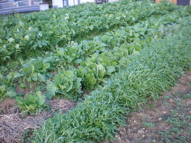 ▼ミズナやキャベツ、ダイコンもよく育っています。
