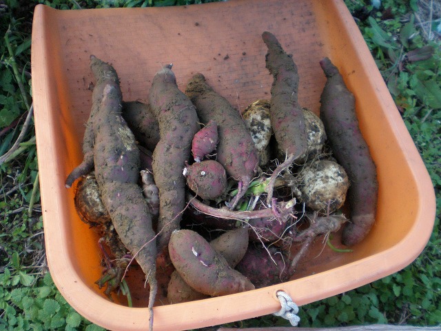 ▼収穫したサツマイモ。白いサツマイモなんてあるんですね。