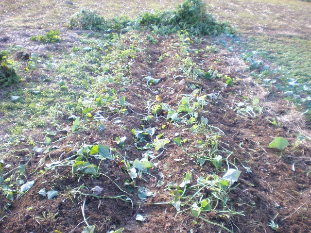 ▼最初にサツマイモの蔓(つる)を刈り取ります。