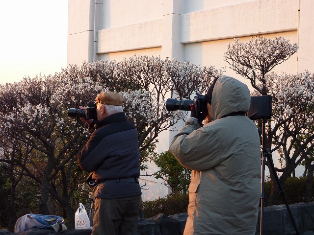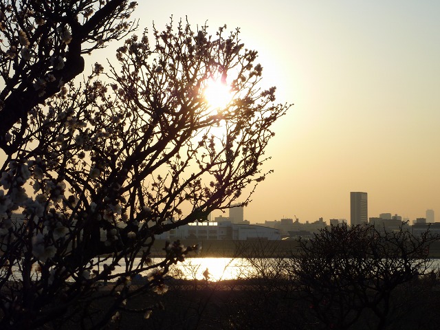 ウメがちょうど見頃を迎えていて、日没近い陽光を受けて、