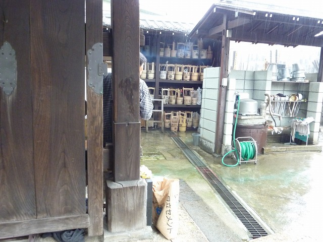 到着。切妻造り茅葺きの立派な山門で雨やどり