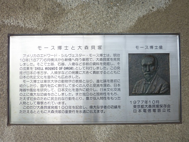 発見者の「モース博士像」のレリーフと「モース博士と大森貝塚」の解説プレートが。