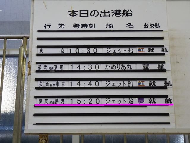 岡田港着。帰りは伊東経由熱海着の15:20発、ジェット船「夢」号。