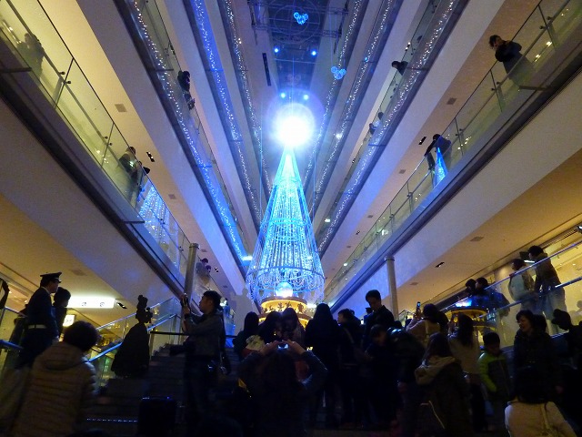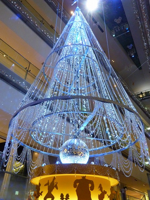 ツリー上空にはミッキー形のオブジェが輝きを添えます。