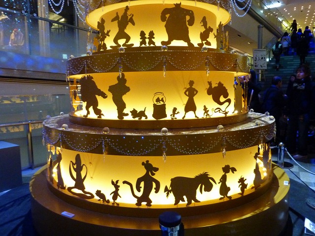 ツリー下部の巨大なケーキオブジェとその周辺には、時間毎の演出により、