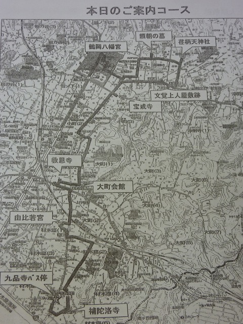 「JR鎌倉駅東口(バス利用)→九品寺バス停→補陀洛寺(特別拝観)→由比若宮(元八幡)→教恩寺(特別拝観)→大町会館(お弁当)→宝戒寺→文覚上人屋敷跡→荏柄天神社→源頼朝の墓→鶴岡八幡宮(解散)高低差なし・約6km