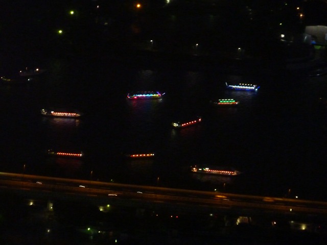 (写真中)眼下の隅田川に浮かぶ屋形船の灯り。
