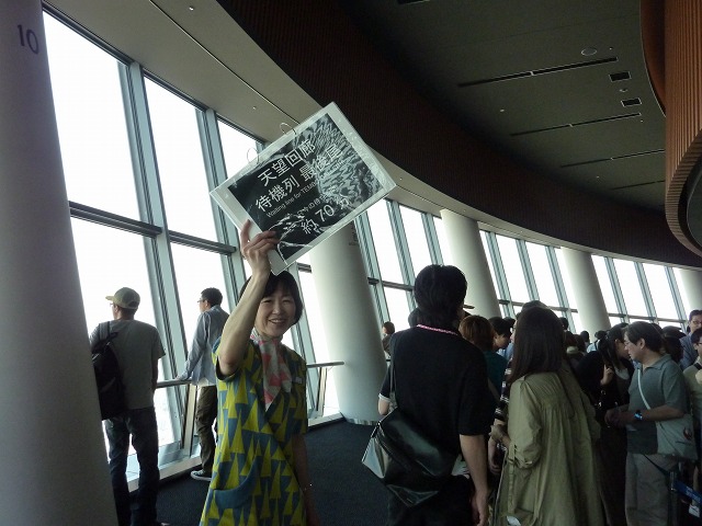 さて、展望デッキから天望シャトル(エレベーター)で「天望回廊」に昇る待機列の最後尾は、