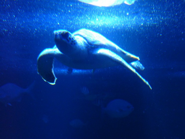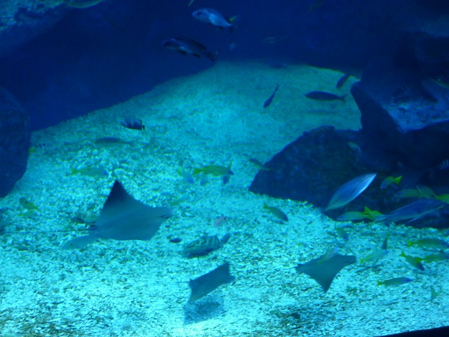 (写真左から)水槽のサメ・ウミガメ・イトマキエイ3尾。