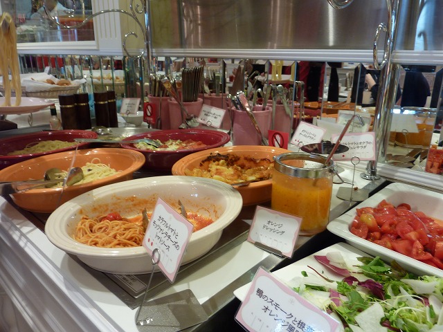 大人可愛いスイーツ、パスタやサラダなどのお料理をビュッフェ・スタイルで食べられるお店で、