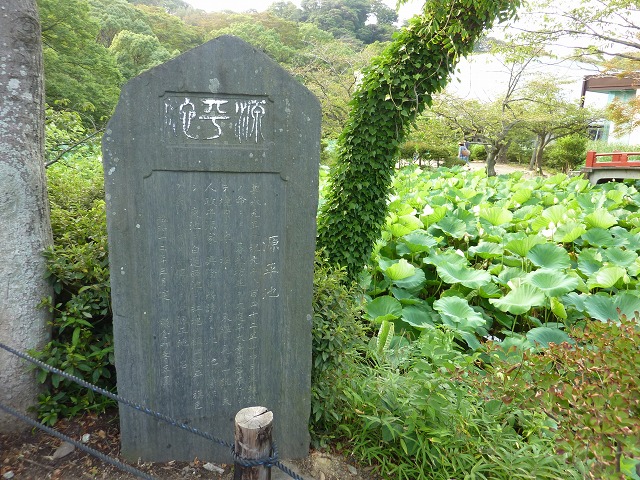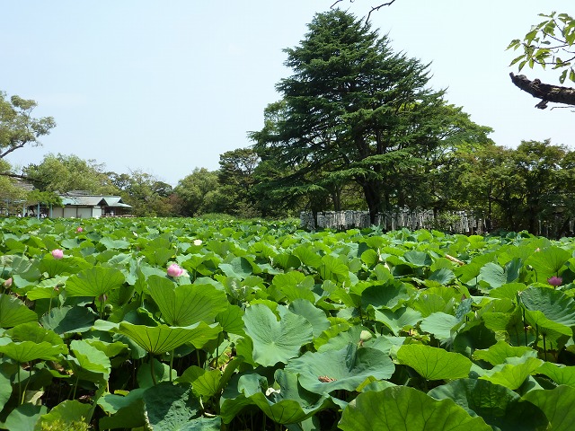 当初は社殿に向かって参道右手の源氏池に白ハスを、左手の平家池に赤いハスを植えたとの話ですが、