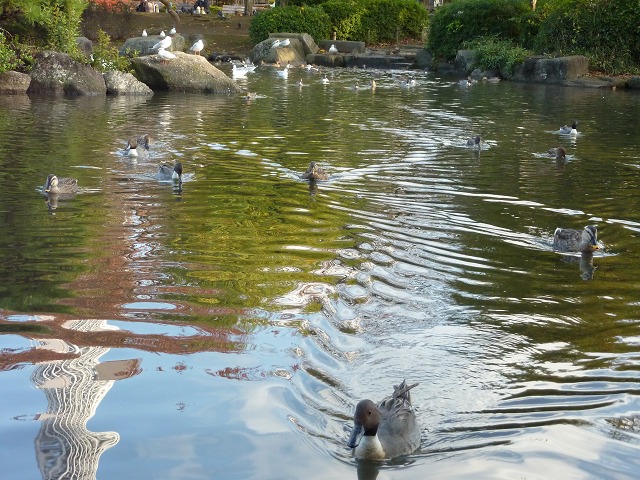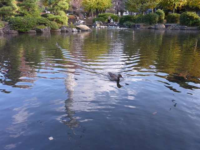 カモが描き出す波紋がひょうたん池に映るスカイツリーの影を乱すのも一興。