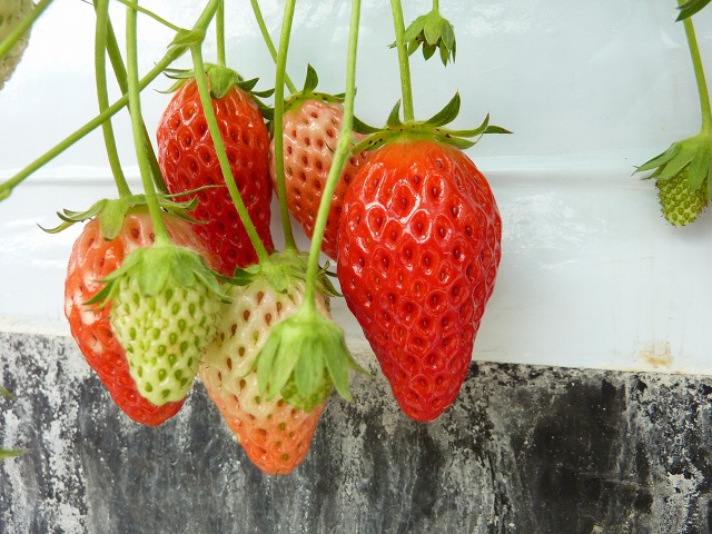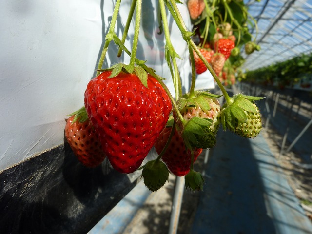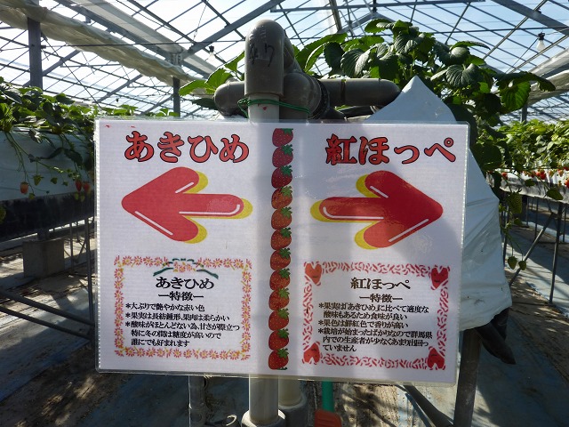 大ぶりな「章姫(あきひめ)」(写真中)と適度な酸味の「紅ほっぺ」(写真右)の食べ比べができます。