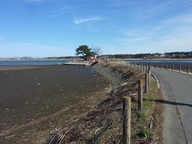 (写真左)桜並木の遊歩道を前方の浮島に向かって歩いていますが、