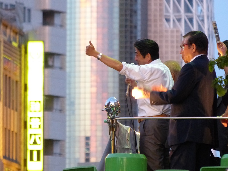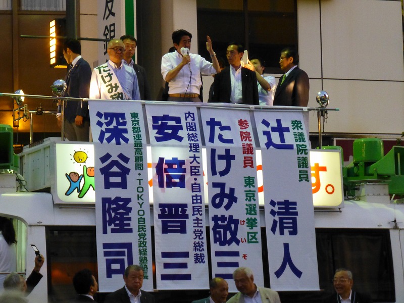 21日(日)の参院選投票日を明日に控え、雷門前で行われた自民党「たけみ敬三」候補の最後の演説と、安倍総理らの応援演説を見に行きました。