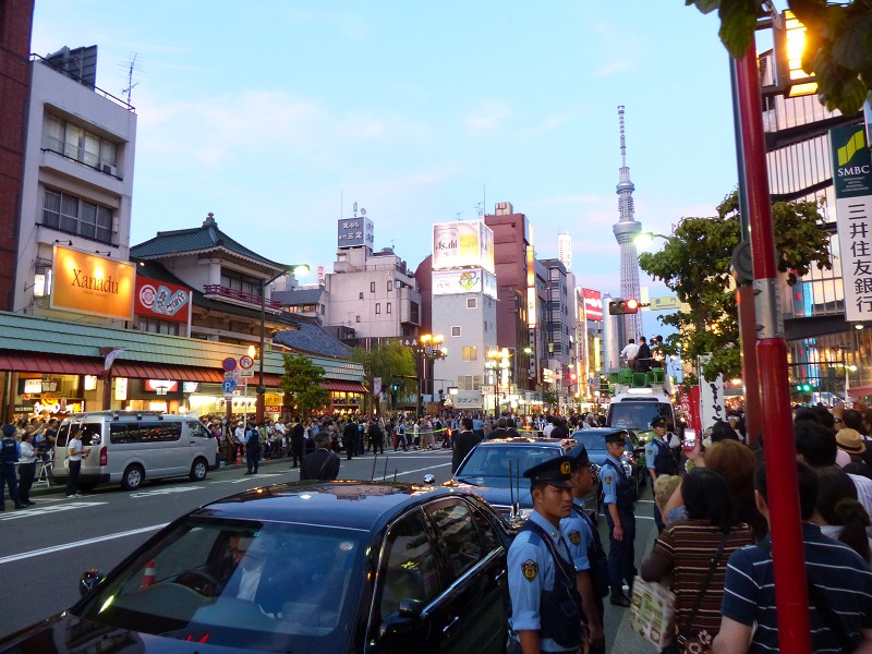 多くの聴衆でごったがえす雷門前と警備の物々しさ。