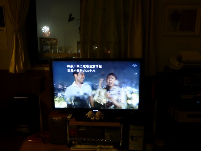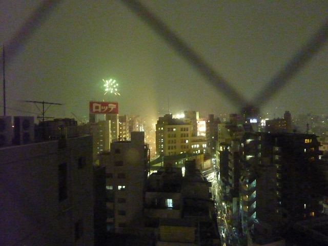 室内から見た第二会場の花火と右手、傘を挿して家路に急ぐ見物客の人たち。